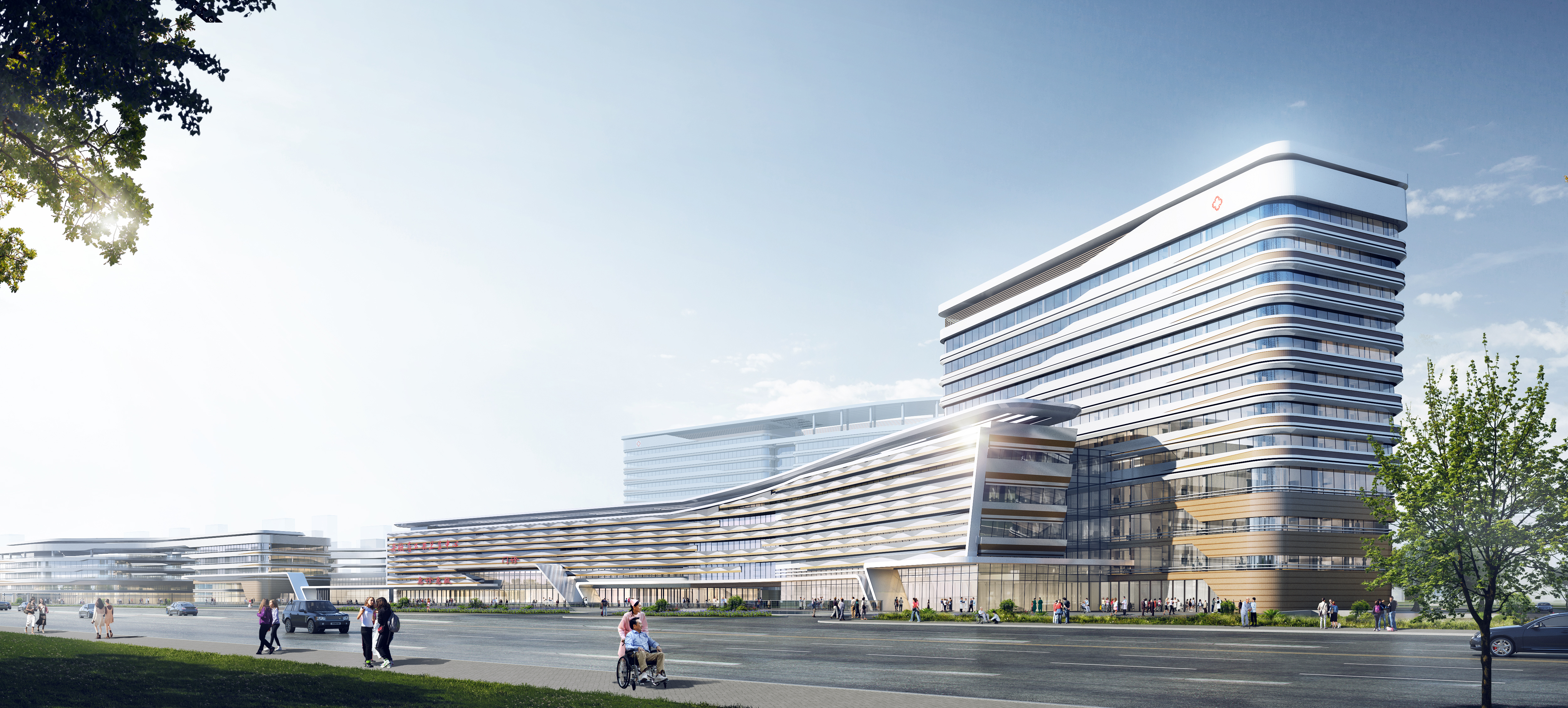 2、综合医疗区采用集中式布局,门急诊位于南侧沿城市道路展开,方便患者到达;病房楼位于北侧,医技区位于中心部位,方便门急诊和病房使用。