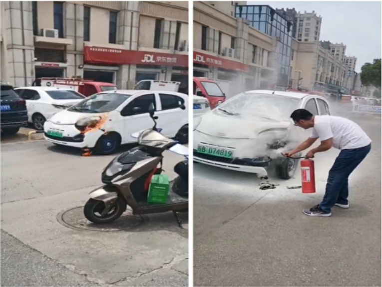夏至已至,盛夏伊始,在酷暑天气下,各类涉电用品易高温自燃,引发火灾。6月27日中午1点,一辆新能源汽车行驶至赤铸山路社区附近时,引擎盖突然起火自燃,且周围车辆密集,情况十分危急。