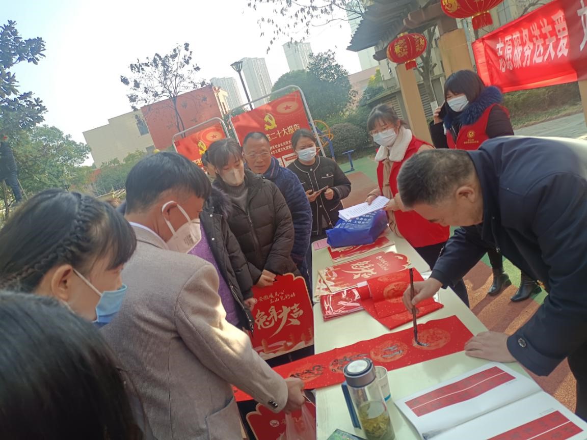 在公租房小区开展写春联、送祝福活动,活动现场,书法家们饱蘸浓墨,在大红的纸上飞笔书福,既喜庆又红火,活动现场洋溢着一派节日的喜庆气氛。